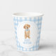 Preppy puppy golden retriever birthday with blue bow and blue plaid.