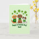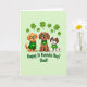 This card shows three cheerful puppies lined up across a light green background, smiling with bright eyes behind green-framed glasses as if they’re sharing a private joke with someone they adore 💚. A ginger pup wears a dark green sweater with a shamrock on the chest, leaning companionably toward a chocolate-brown pup in a green bandana, while a smaller white-and-brown patched pup in a green-and-white striped jumper nestles close on the other side. Their faces tilt slightly toward one another, giving the scene a cozy, affectionate feel like close friends huddled in for a photo. Above their heads, shamrocks in different sizes float like confetti, spreading across the top half of the design in rich green tones ☘️. The greeting text sits below the puppies, centered and easy to read, with “Happy St. Patrick’s Day! Dad!” in a friendly green font against the pale background. The spacing leaves plenty of open air around the words, keeping the focus on the trio while still making the message stand out. The final detail is the scattered shamrocks drifting overhead in a loose arc, with the largest shapes near the top center and smaller ones tapering outward.