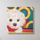 The cutest puppy in a pop art background. Printed from my original acrylic painting. 12" x 12" on stretched 1.25" canvas.