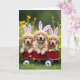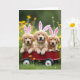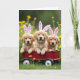 This design shows three golden-furred puppies sitting close together in a shiny, bright red little wagon, each wearing soft pink bunny-ear headbands 🐰. They face forward in a neat row, with the middle pup leaning slightly ahead as if nudging closer to its friends, mouth open and tongue peeking out in a friendly, excited moment. The two pups beside it look calmer, their dark eyes turned toward the viewer with a gentle, affectionate focus that feels like shared companionship. Across the top, the greeting “Happy Easter” appears centered in a light pastel tone, standing out softly against the blurred background. A smaller line of text sits near the bottom edge in a matching color, tucked just above the wagon rim. Behind them, the background fades into soft green foliage with scattered little yellow wildflowers 🌷. The pink bunny ears sit upright on each pup, contrasting with their warm coats and the glossy red wagon.