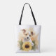 Watercolor artwork of a cute puppy with a yellow sunflower.
