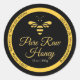 Stylish yellow honeybee on black background with yellow border. Product name written in a decorative font.