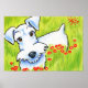 "Pure Schnauzer" depicts a white Schnauzer standing in a field filled with poppy flowers. Ink and colored pencil illustration by Andie.