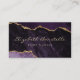 This elegant modern business card features a purple watercolor agate design trimmed with sparkly gold faux glitter. Personalize it with your name in light golden handwriting-style script and business information in sans serif font. The purple agate image is repeated on the reverse.