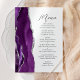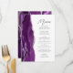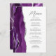 This elegant modern wedding menu features a purple watercolor agate border trimmed with faux silver glitter. The customizable text combines charcoal gray handwriting script and sans serif fonts on a white background. The purple and silver agate design is repeated on the reverse side.