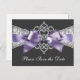 Pretty diamonds and bow purple and black save the date postcards. You can add your details to the front and back in the font style and color and wording of your choice. You can delete the line and postage stamp placement marker if you don't want them on your postcards.
