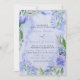 Design features a printed colored with floral element in shades of purple and dusty blue over greenery leaves branch wreath and peony tulip hyacinths flowers on a light lilac light blue watercolor background.. Great for your wedding celebrations!