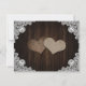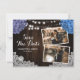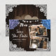 Romantic rustic purple and blue floral photo wedding save the date card featuring hydrangea flowers, string lights and elegant floral lace against a barn wood background. There are two burlap hearts and white floral lace on rustic wood background at the back.