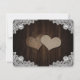 Romantic rustic purple and blue floral wedding save the date card featuring hydrangea flowers against a barn wood background adorned with white floral lace and twinkle lights.