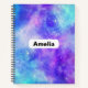 Spiral notebook with a cosmic abstract background. Swirling vibrant colors of light blue, pink and purple. White stars scattered around.