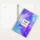 Spiral planner with a cosmic abstract background. Swirling vibrant colors of light blue, pink and purple. White stars scattered around.