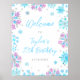 This elegant and glamorous birthday party welcome sign features watercolor purple and blue faux glitter snowflakes and sparkles on a white background. The text combines handwritten script and modern sans serif fonts for a classy and sophisticated look. This is perfect for a winter or Christmas birthday party.