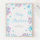 This elegant and glamorous Merry Christmas sign features watercolor purple and blue faux glitter snowflakes and sparkles on a white background. The text combines handwritten script and modern sans serif fonts for a classy and sophisticated look. This is perfect for a Christmas party.