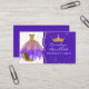 Glamorous beauty pageant coach business card, with graphics of a purple and gold glitter dress, against a white and purple background, with gold glitter looking accents. Personalize the text to suit your business needs.