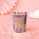 These paper cups feature a soft pretty gel print made of purple and gold inked squares.