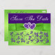 This romantic lime green and purple floral save the date postcard has a PRINTED ribbon and bow with a pair of PRINTED diamond jewel and FAUX glitter (simulated) joined hearts on it that matches the wedding invitation shown below. If you require any additional matching items, please email niteowlstudio@gmail.com with your request.