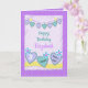 Designed in purple, green, lilac and yellow with bunting, hearts and flowers.