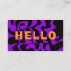 This eye catching design has a bold font with the word "hello", on a background with an asymmetric abstract, swirling pattern in black. With bright colors, in purple for the backdrop, and orange in the typography on the front.
