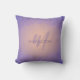 This decorative pillow combines a soft peach-toned center with a bold purple background, beautifully bordered by an ornate black damask pattern. At the heart of the design, an editable monogram initial and customizable surname are displayed, making it easy to create a personalized accent piece. The rich interplay of purple, peach, and black creates a stylish and modern yet elegant look.