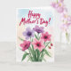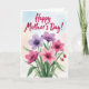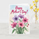 This card features a watercolor-style bouquet that fills the lower two-thirds of the front, like a garden offering held close with a gentle, affectionate touch ❤️. Five open flowers stand out with soft purple and lively pink petals, their translucent layers blending into one another as if leaning together in friendly closeness. Each bloom has a deep black center dotted with stamen details, creating a strong contrast that draws your eye inward. Beneath the blossoms, green stems and slim leaves in mixed emerald and forest tones weave together like supportive arms around the arrangement. On the right side, two small buds with crimson tips peek out from the foliage, adding a quiet hint of growing love 🌼. The background fades from sky blue at the top into a warm creamy beige near the bottom, keeping the scene light and airy. Near the top, the words “Happy Mother’s Day!” appear in flowing fuchsia lettering, centered above the flowers. The petals show soft purple edges melting into pink washes, while the black centers sit crisp against the pastel blooms.