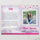 A purple and pink daisy design funeral program for your loved one's funeral or memory service that is geared towards a young or teen girl. Template allows you to fill out their name, date of birth, date of death, obituary / tribute, and Order of Service and update your favorite photo memories. Designed on a standard 8.5 x 11" sheet of paper ready to be folded in half. Background design is purple clouds and daisy borders.