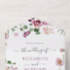 A wedding invitation that features a stunning arrangement of wildflowers in shades of purple and pink, complemented by lush greenery, and accented with elegant calligraphy, is truly a work of art. The brushstrokes of the watercolor paint create a soft and dreamy atmosphere, while the intricate details of the wildflowers and greenery make the design appear both bold and delicate at the same time. The rich hues of purple and pink blend seamlessly with the natural greens, creating a beautiful and harmonious color scheme that is sure to impress. The elegant calligraphy provides a sophisticated touch, adding a sense of refined beauty to the overall design. This modern watercolor wedding invitation is the epitome of elegance and natural beauty, making it the perfect choice for couples who want to make a statement with their wedding invitations. It sets the tone for a romantic and unforgettable wedding celebration, and is sure to leave a lasting impression on all who receive it.Matching items are available. Check out our other items from this collection. https://www.zazzle.com/collections/watercolor_wildflowers_purple_pink_collection-119810120149791613