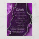 Celebrate every detail of your wedding with this purple and silver agate marble details card. Rich amethyst hues, organic stone textures, and shimmering silver accents combine to create a sophisticated, jewel-toned design that complements a modern, elegant, or glamorous celebration. The striking contrast of deep purple and metallic silver provides a polished backdrop for sharing both reception and lodging information, keeping your guests informed in style. Fully customizable with your event schedule, hotel details, and special notes, this agate-inspired card adds a cohesive and refined touch to your wedding stationery suite, perfect for fall or winter weddings.
