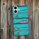Faux distressed wood in turquoise blue and purple with a chipped paint effect repeated pattern phone case.