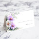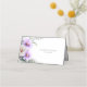 A purple and white daisies wedding table place card that includes the bride and groom's names along with their wedding date.