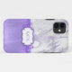 Chic iPhone case done in a white and purple marbled look, across the top and a purple foil look, across the bottom of the case. A white with purple glittery framed text area, has purple text ready to personalize, to suit your needs.