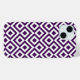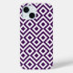This bold, geometric, regal purple and white pattern is an original ornamental design. Purple diamonds with white borders are surrounded by royal purple meanders which angle around them. White zigzags separate the winding purple paths and offset diamonds.