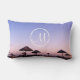 A purple blue and pink sunset on a Southern California beach with thatched palapas oozes relaxation and reflection. Relax, smell the ocean air, and recall memories of summer whenever you use this chic, stylish, photography custom monogram lumbar pillow. Makes a great housewarming gift!
