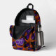 This cool basketball backpack features a random pattern of varied size basketballs turned every which way on a black background - each of the basketballs in the pattern has two recolored panels--one purple and one black - customize with the athlete's name & jersey number - by katz_d_zynes