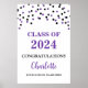 Custom text graduation party poster with black and purple confetti.