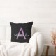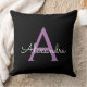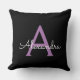 Black and Purple Script Monogram Name and Initial Pillow. The pillow makes the perfect sweet 16 birthday, wedding, bridal shower, baby shower or bachelorette party gift for someone decorating her room in style.
