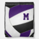 This volleyball themed drawstring backpack for a boy or girl features the realistic image of an abstractly oversized volleyball with black, purple and white panels, upon which you can customize the athlete's monogram or jersey number - by katz_d_zynes