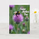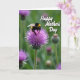 This card features a close-up nature scene where a fuzzy black-and-gold striped insect rests on a rich purple flower, leaning in as if sharing a quiet moment with it ❤️. The insect’s translucent wings catch the light, and the flower’s spiky petals spread outward in shades of magenta and lavender, creating a soft, romantic closeness in the way they meet. The main subjects are sharply detailed, showing tiny hairs on the insect and the textured surface of the bloom. Behind them, an emerald-green background fades into a gentle blur, with only faint hints of other plants in the distance. Warm natural lighting highlights the golden bands against the cooler purples, giving the scene a tender, calm glow 🌼. In the upper right, a short message appears in small white lettering that stands out clearly against the green. The overall layout keeps the insect and flower centered as the main focus, with the text tucked neatly away from the focal point. The purple bloom sits slightly below center while the green backdrop fills the frame with a smooth, out-of-focus wash.