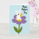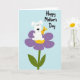 This card shows a large, stylized flower with wide, rounded purple petals circling a bright yellow center, like a sunny stage for a sweet little scene. A bigger white animal with tiny black dot eyes and a small black snout sits on the yellow center, angled toward a smaller golden-yellow animal perched nearby on a petal. Their close spacing and gentle, attentive pose suggest a caring bond, like quiet friendship or a soft, affectionate moment ❤️. A green stem runs down from the bloom with two simple leaves, keeping the composition grounded and tidy. Behind everything is a smooth pale blue sky that stays flat and uncluttered, letting the characters and flower carry the mood. In the upper right corner, a short celebratory message appears in a flowing, hand-drawn style, set in a dark ink color that stands out clearly against the blue background 🌼. The colors stay bright yet soft—blue, purple, yellow, white, and green—with minimal shading and no busy texture, giving the illustration a storybook-like look. The flower’s yellow center is circular and radiant, with the white animal seated right on top and the smaller golden-yellow animal resting on the nearest purple petal.