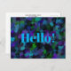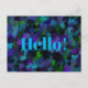 Purple, Blue, Green and Black art began as a photo of a peacock's colorful feathers and transformed into this colorful Hello! postcard.