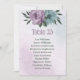 Unique table number seating chart card featuring romantic dusty purple and blue flowers and green leaves.