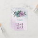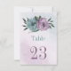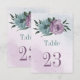 Unique table number card featuring romantic dusty purple and blue flowers and green.