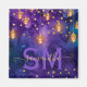 This enchanting design features a rich watercolor blend of deep purples and blues, evoking a dreamy night sky. Suspended across the top are glowing golden lanterns, each delicately strung with twinkling lights and surrounded by scattered golden dots that add a festive sparkle.