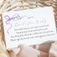 A book request insert card for baby shower. Featuring a watercolor purple bow with poem: "ONE SMALL REQUEST, WE HOPE NOT TOO HARD PLEASE BRING A BOOK INSTEAD OF A CARD THEY'LL CHERISH THE BOOK, WELL LOVED OR BRAND NEW PLEASE SIGN THE INSIDE WITH A MESSAGE FROM YOU!"