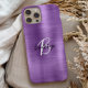 This elegant personalized phone case features a monogram and first name in modern black and white script on a trendy purple brushed metal background.