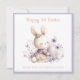 Cute Easter bunny girl with an Easter egg in soft purple shades. Floral border on the back side. 1st Easter card for a baby girl or a little girl. Easily personalize all the text. - Kate Eden Art.