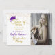 Graduation party invitation in purple school colors. Created with purple cap, purple and white balloons and faux gold glitter, with space for your own photo. All text front and back already formatted and ready for your own text details. Other colors available in this same design. Photo credit: Pixabay image by Lorri Lang