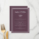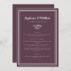 Simple, minimalist and elegant Wedding Menu features a contemporary design with a double frame crisp white border in on a cassis purple background. Traditional wording provides timeless yet modern sophistication. Personalize wedding design with your menu details in white lettering and script. The back of the card matches in solid matching purple cassis.