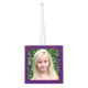 Photo cube to customize for the Christmas tree. Purple color with four photo templates around the sides and text on the top. Each square photo has a thin purple line frame, and either orientation will fit the spaces. On top the sample wording is "Merry Christmas" with the year date.