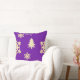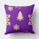 A colorful Christmas purple throw pillow, featuring snowflakes, Christmas trees and swirls scattered over a festive purple background.