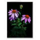 A distinctive image of buds and blossoms of purple coneflower against a dark background.